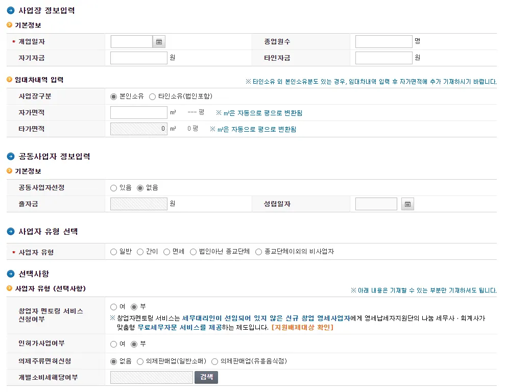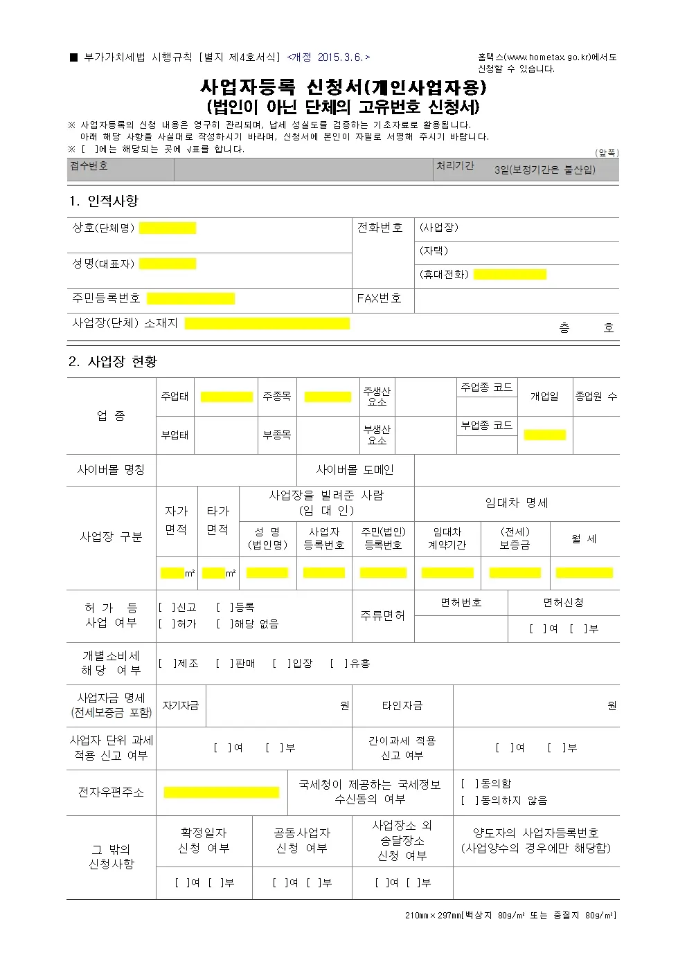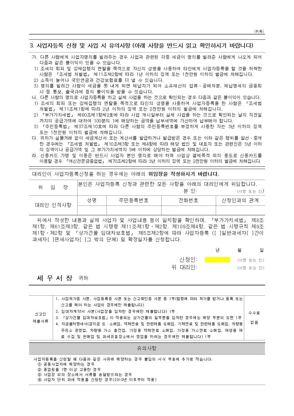 ② 사업자등록 신청서는 세무서 민원봉사실에 구비되어 있으며, 미리 작성할 항목들을 확인하여 작성하신 후 신청에 필요한 서류와 함께 제출하시면 됩니다.