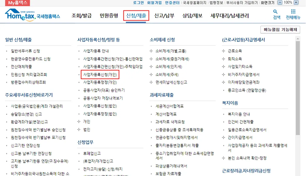 ② 신청/제출 - 사업자등록신청(개인) 클릭