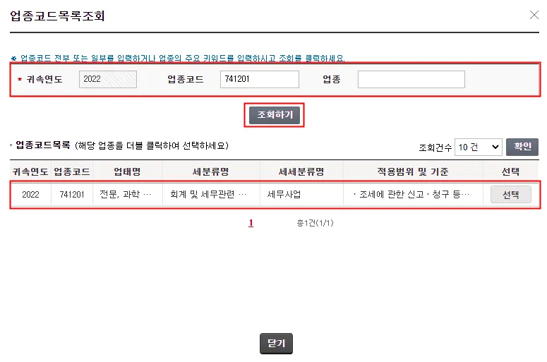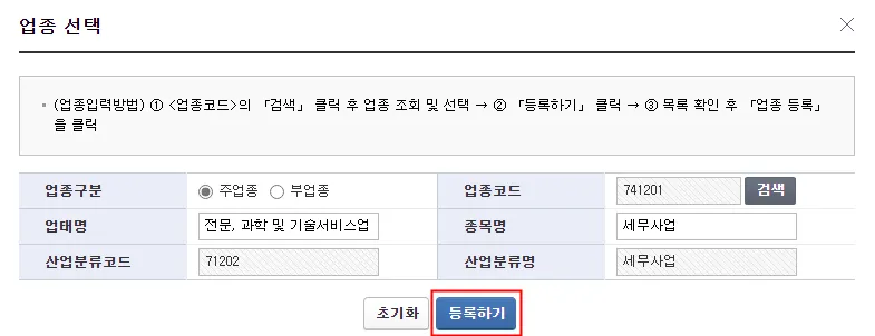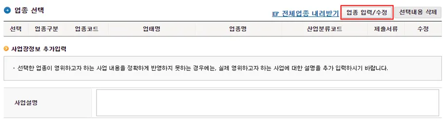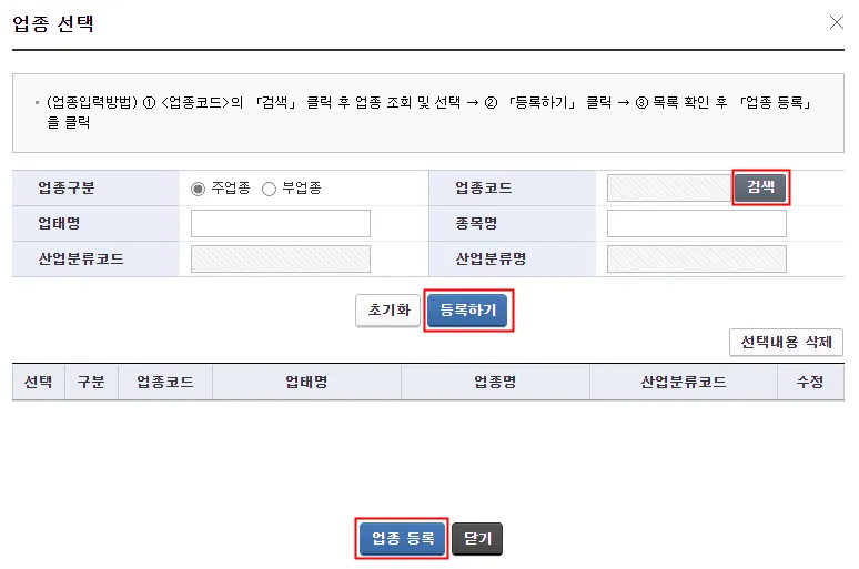3) 아래 업종코드목록을 확인 후 해당되는 업종을 더블클릭