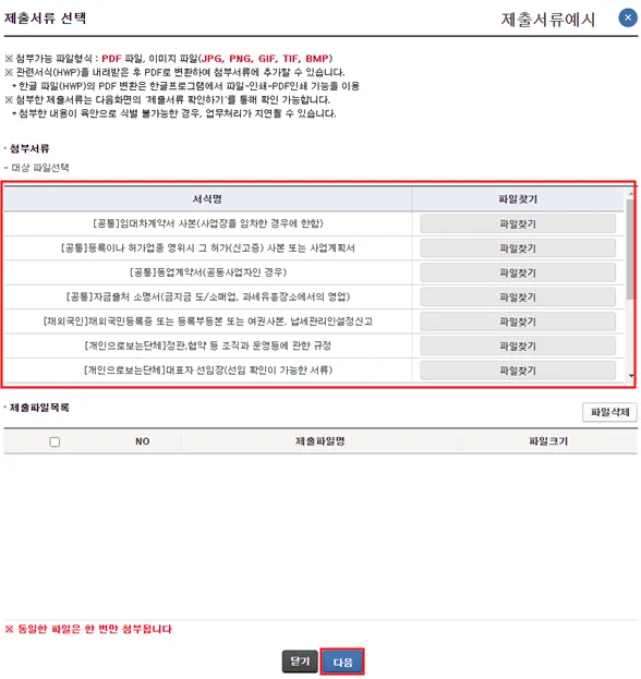 제출하실 서류가 있다면 파일을 첨부하신 후 다음을 클릭해주세요.