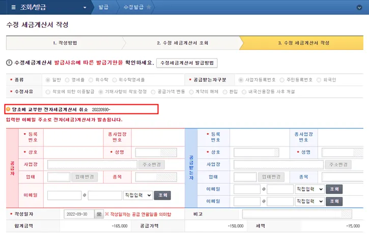 ‘당초에 발급한 전자세금계산서 취소’ 내용을 확인한 후 , ‘새로 작성하는 전자세금계산서’에 수정할 내용을 올바르게 작성합니다.