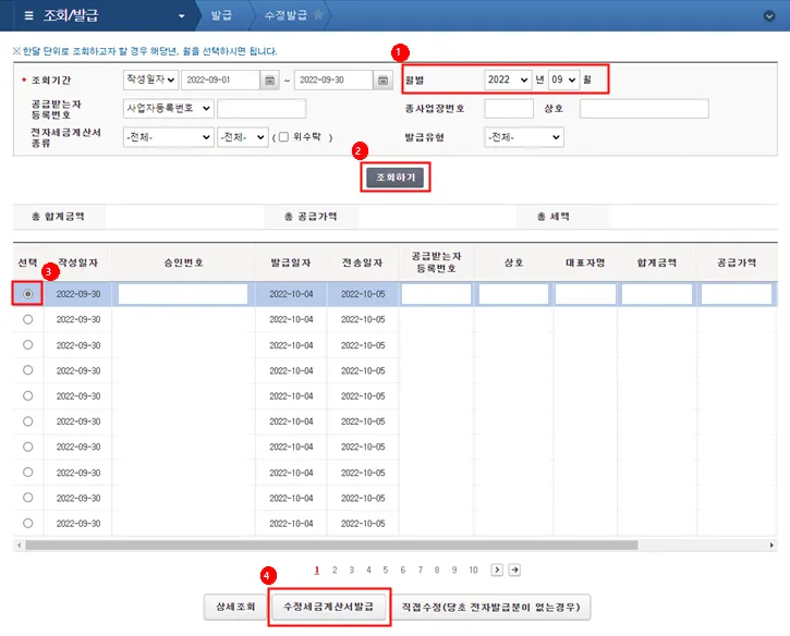 1) 발급한 월별 선택 : 발급한 월을 선택하면, 해당 월에 발급한 세금계산서를 조회 가능