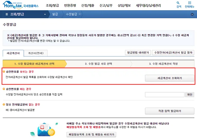 (이메일 주소 착오기재나 미입력하여 발급한 경우, 메일발송목록 조회 및 재발송에서 이메일 주소를 수정한 후 재발송 하시면 됩니다.)
