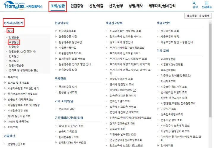 ② 조회/발급 - 전자세금계산서 - 발급 - 수정발급 클릭