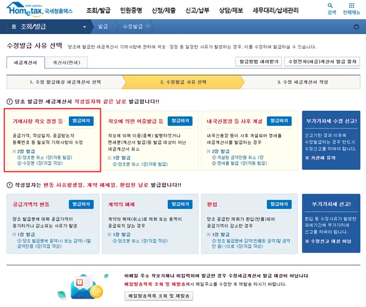 여러 사유 중 많은 수정발급 사유인 ‘기재사항 착오 정정 등’을 선택하여 안내 드립니다.