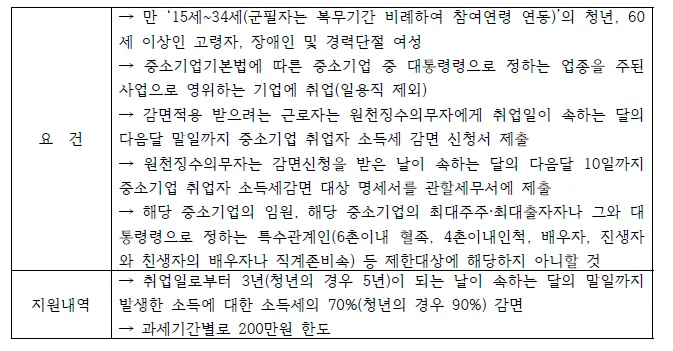 청년 및 취약계층의 중소기업 취업 유인 제고를 위하여 청년 등이 일정요건을 충족하는 중소기업에 취업하는 경우 취업일로부터 3년(5년)이 되는 날이 속하는 달의 말일까지 발생한 소득에 대한 소득세의 일정률을 감면하는 제도