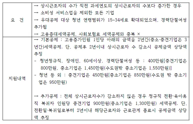 기업의 고용 활성화를 지원하기 위하여 기존 고용증대세액공제, 사회보험료 세액공제 등 5개 고용지원 제도를 통합고용세액공제로 일원화 하여 상시근로자 수 증가에 대해 기본공제를 적용하고, 비정규직 근로자의 정규직 전환 촉진과 일·가정 양립의 지원을 위하여 정규직 전환자 및 육아휴직 복귀자에 대하여 추가공제를 적용하는 제도
