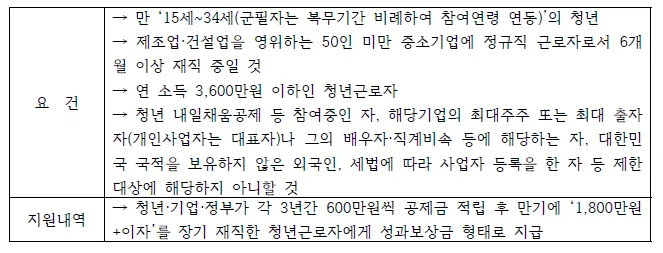 청년이 중소기업에서 장기근속할 수 있도록 청년·기업·정부가 2년간 공동으로 적립하여 청년의 자산형성을 지원 및 청년의 초기 경력형성을 통한 미래설계 기반을 마련하고 기업은 우수인재를 안정적으로 고용할 수 있도록 지원하는 제도