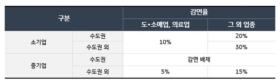 2) 감면한도 : 연 감면한도는 1억원이며, 상시근로자 수가 감소한 경우에는 1억원에서 1명당 500만원을 차감한 금액을 한도로 보게 됩니다.