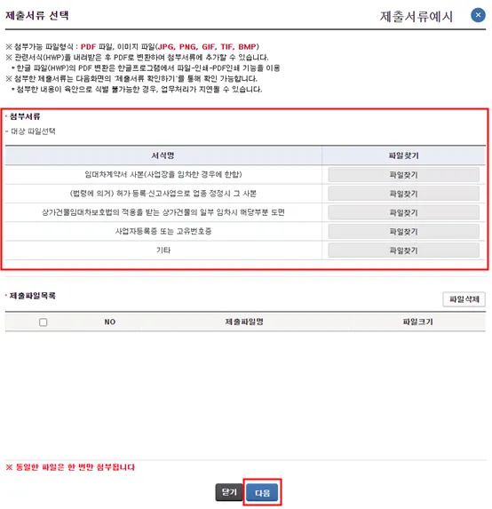 제출서류를 첨부하신 후 다음을 클릭해주세요.