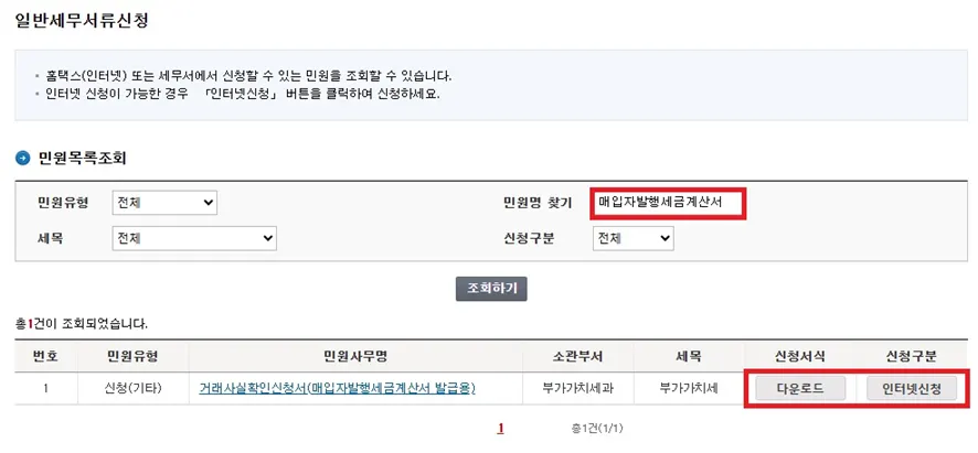 ③ [민원명 찾기에서 매입자발행세금계산서 검색] - [서식 다운로드] - [서식 작성 후 인터넷 신청]