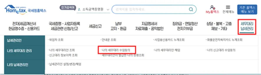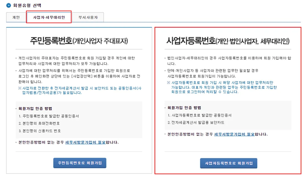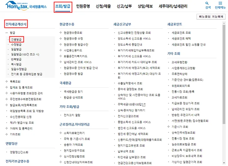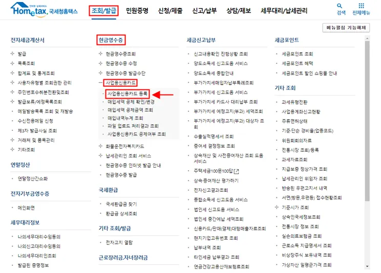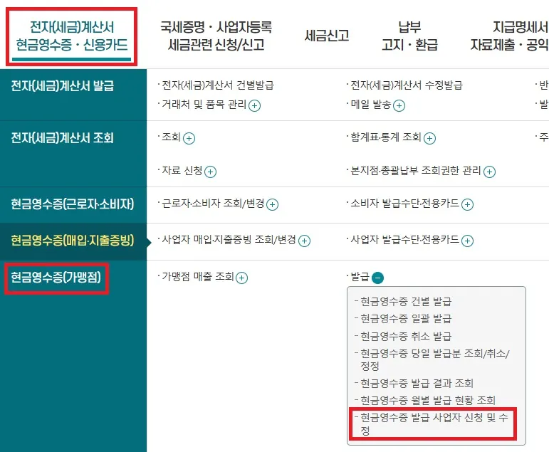 [전자(세금)계산서 현금영수증 신용카드] - [현금영수증(가맹점)] - [현금영수증 발급 사업자 신청 및 수정]